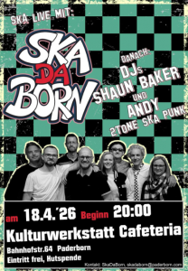 Die Paderborner Ska-Band SkaDaBorn spielt live in der Cafeteria der Kulturwerkstatt. Im Anschluss sorgen DJs Shaun Baker und Andy mit 2Tone Ska Punk für Tanzstimmung. Eintritt frei – Hutspende willkommen.